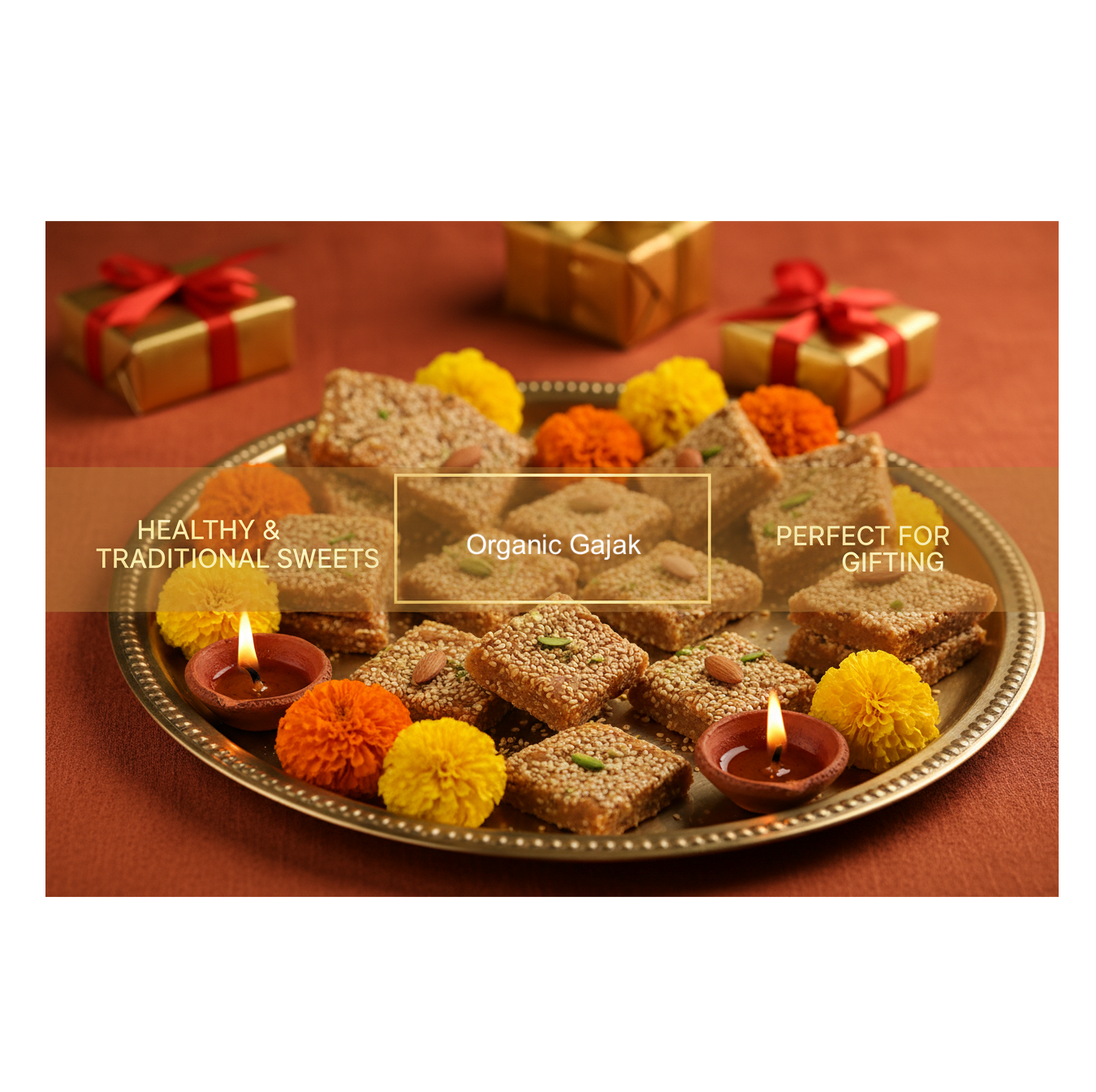 - Our Organic Gajak is made with only three ingredients: 1) Premium organic white sesame seeds (Til) (58%), 2) Organic jaggery (37%), 3) Organic cow ghee (clarified butter) (5%).