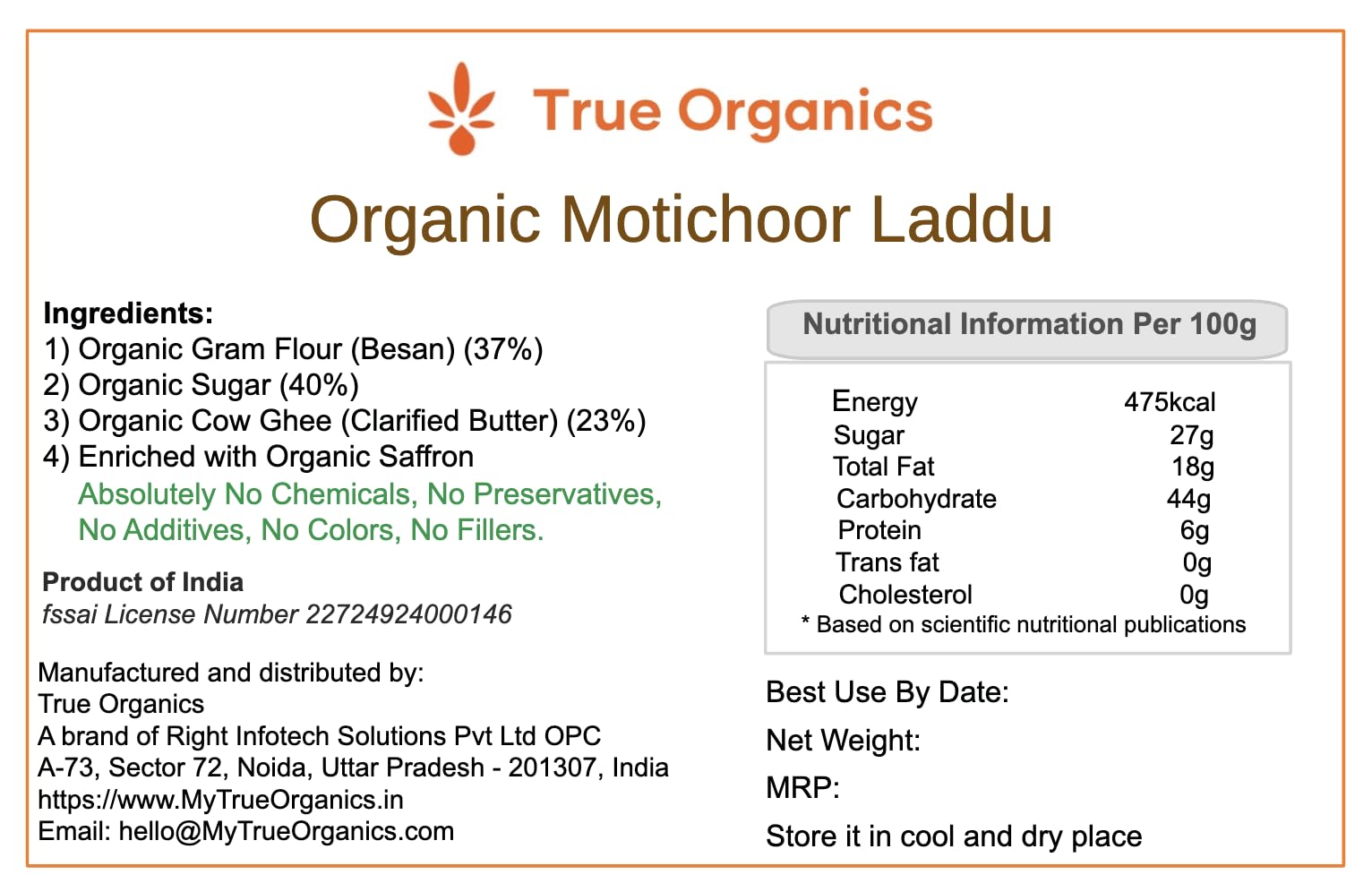 - Our Organic Motichoor Laddus are made with only three ingredients: 1) Organic Gram Flour (Besan) (37%), 2) Organic sugar (40%), 3) Organic cow ghee (23%), enriched with Organic Saffron, pinch of lemon juice.